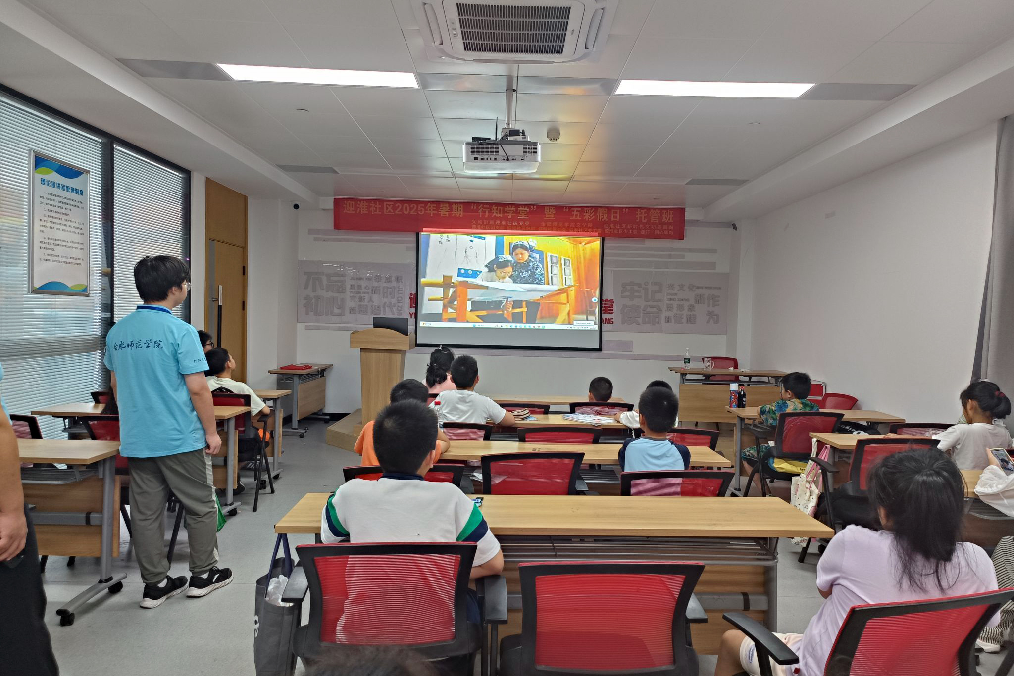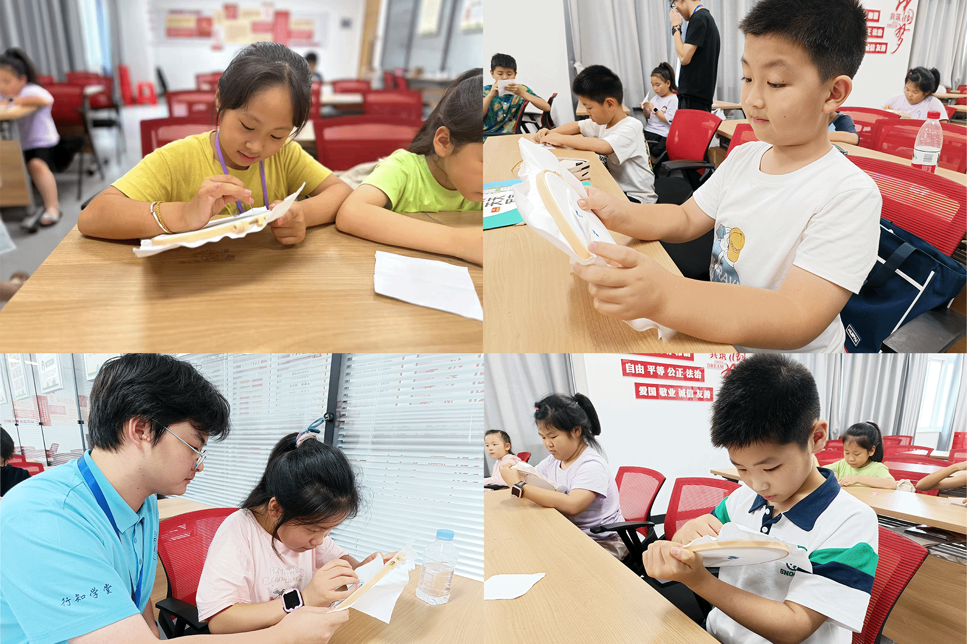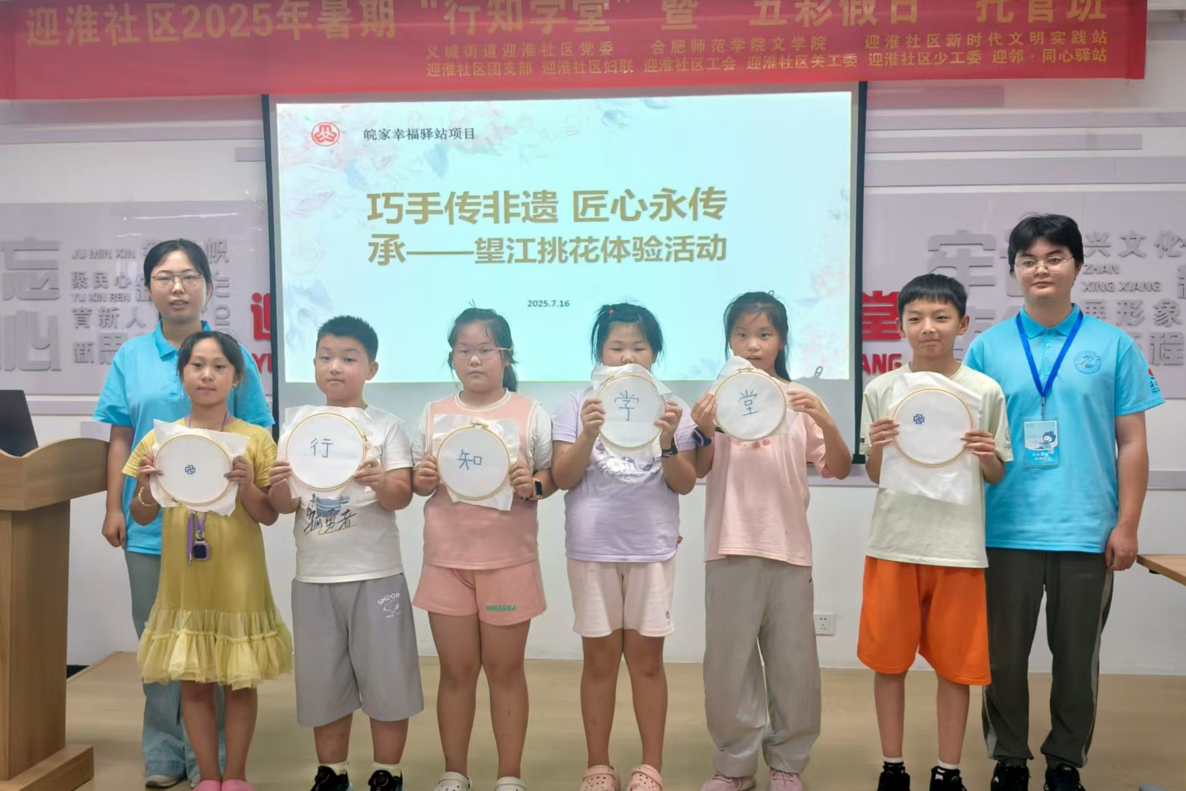 為幫助學員深入理解望江挑花的文化價值,活動特別設(shè)置“非遺小講堂”環(huán)節(jié),播放何冬霞對國家非遺望江挑花的介紹視頻,帶領(lǐng)小朋友們云游安慶皖江中等專業(yè)學校國家非遺望江挑花保護與傳承基地。展覽館內(nèi)陳列的挑花作品琳瑯滿目,每一幅都蘊含著深厚的文化底蘊。而基地的迎賓廳,更是仿照當年望江挑花進入人民大會堂安徽廳的裝飾場景復制而成。望江作為“三孝之鄉(xiāng)”,迎賓廳內(nèi)還特別展示了以二十四孝為主題的挑花作品,傳遞著孝道文化的深刻內(nèi)涵。
